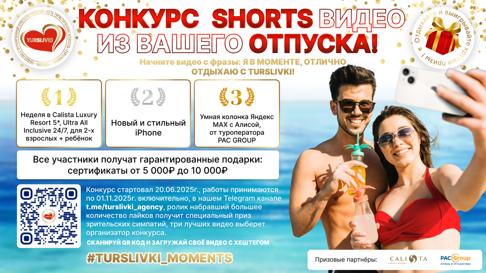 🎁 Участники, не занявшие призовые места, получат гарантированные подарки: сертификат от 5000₽ до 10000₽ на покупку тура в сети ТА «ТУРСЛИВКИ».
